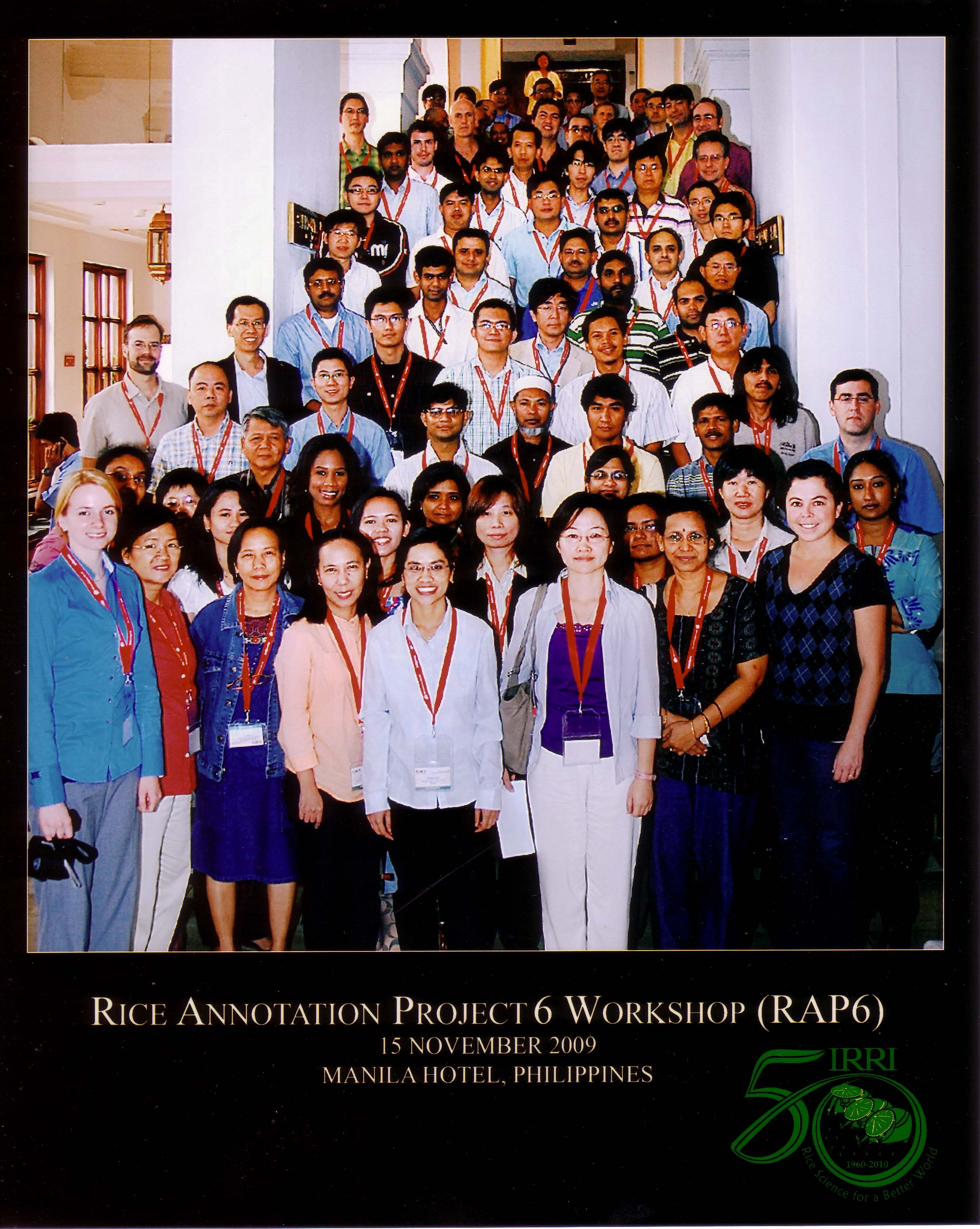 The Sixth Rice Annotation Project Meeting (RAP6) was held in Manila, Philippines on November 15th, 2009 as a satellite meeting of the 6th International Rice Genetics Symposium and the 7th International Symposium of Rice Functional Genomics. The workshop-discussion meeting was participated by a total of about 70 researchers including rice researchers as well as researchers of other cereal crops and other plants involved in genome analysis and comparative genomics. The major rice annotation groups, namely, RAP-DB, MSU Rice Genome Annotation, and Gramene presented the current status of their annotation projects. In addition, members of the IRGSP also gave an update on their respective projects on rice genomics. The wrap-up discussion focused on constructing a consensus Nipponbare rice genome assembly. For a detailed program of the RAP6 workshop, please refer here (PDF file, 80KB). |